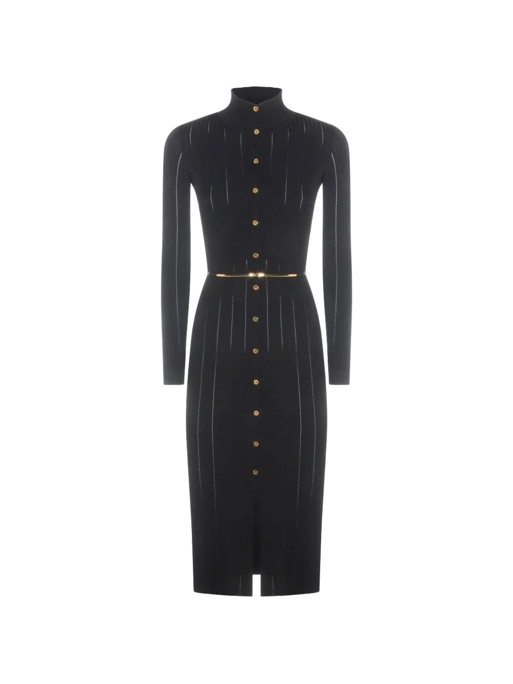 openwork knit fabric with belt dress Highlights - Black - Belt - Long sleeve - Mock neck Imported Composition Silk 80%, Polyamide 20% Washing instructions Hand Wash