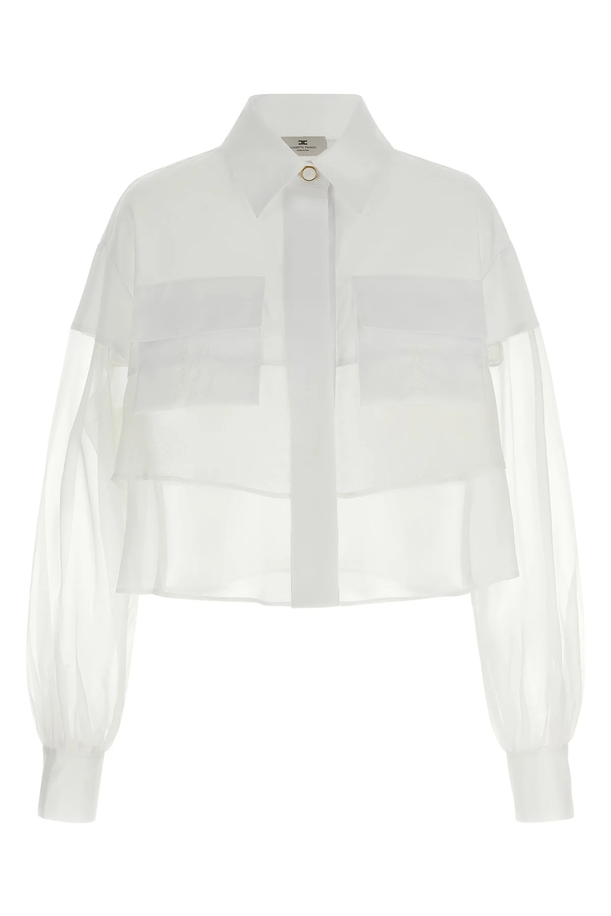 cod. CA11861E2360 Cotton poplin and tone-on-tone organza shirt, crop model, pockets with tone-on-tone crochet logo embroidery, concealed front button closure, long wide sleeves with cuffs. Color: White Size & Fit: oversized fit Composition: 100% cotton Made in: Italy