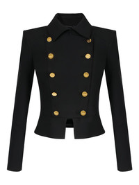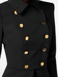 peplum criss-cross jacket Highlights - Black - Padded shoulders - Shirt collar - Long sleeves - Double-breasted fastening - Gold-tone buttons - Criss-cross detail at the back Made in Italy Composition Viscose 47%, Cotton 22%, Polyamide 21%, Spandex/Elastane 10% Washing instructions Read Manufacturer Guidelines