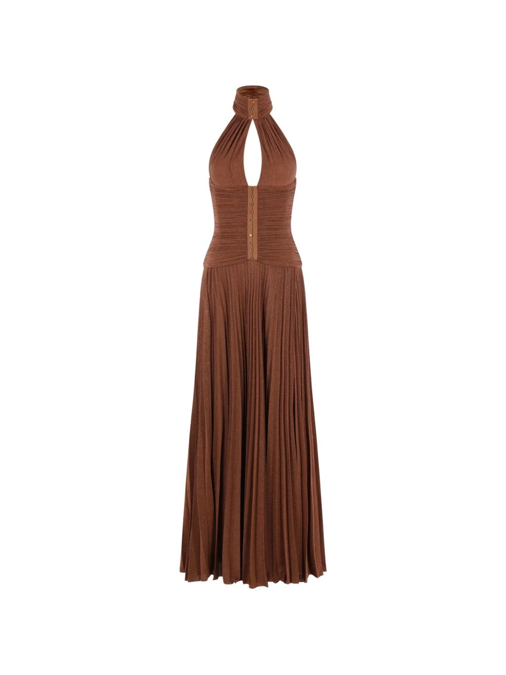 pleated halterneck maxi dress Highlights - Brown - Pleated skirt - Halterneck - Cut-out detailing - Hook and eye fastening Made in Italy Composition Viscose 63%, Polyester 17%, Polyamide 15%, Spandex/Elastane 5% Washing instructions Read Manufacturer Guidelines