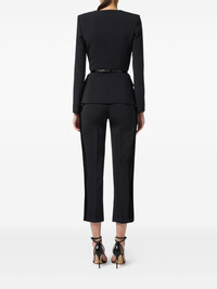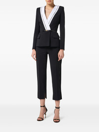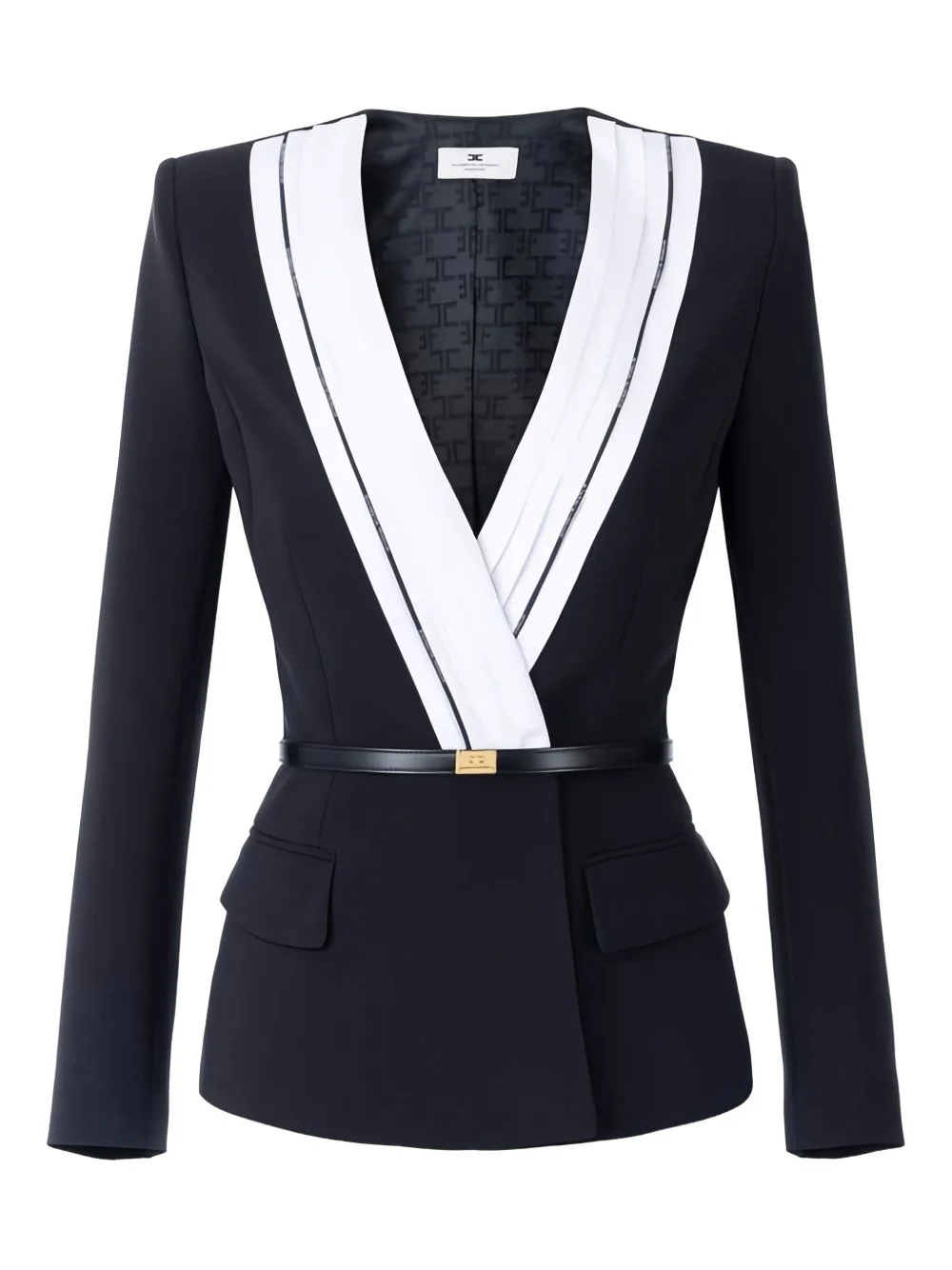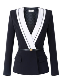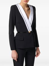 pleated logo-piping jacket Highlights - Black - Contrasting piping - Pleated neckline - Belt - Gold-tone hardware - Peplum hem Made in Italy Composition Polyester 95%, Spandex/Elastane 5% Washing instructions Read Manufacturer Guidelines