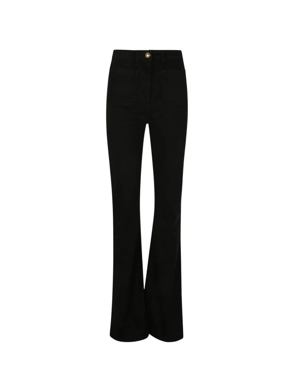 pocket denim trousers Highlights - Black - Cotton - Patch pockets - Flared hem Imported Composition Cotton 97%, Elastane 3% Washing instructions Read Manufacturer Guidelines