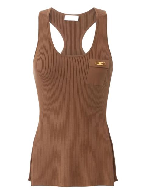 ribbed breast pocket top Highlights - Black - Ribbed knit - Breast pocket - Golden metal logo - Halter neck - Side slits Imported Composition Lyocell 64%, Polyamide 20%, Silk 16% Washing instructions Read Manufacturer Guidelines