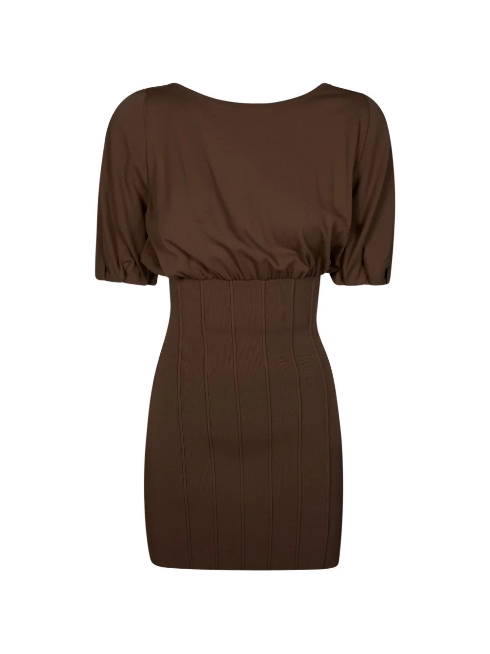 ribbed knitted mini dress Highlights - Brown - Knitted construction - Short sleeves - Concealed zip Imported Composition Viscose 65%, Polyamide 35% Washing instructions Read Manufacturer Guidelines