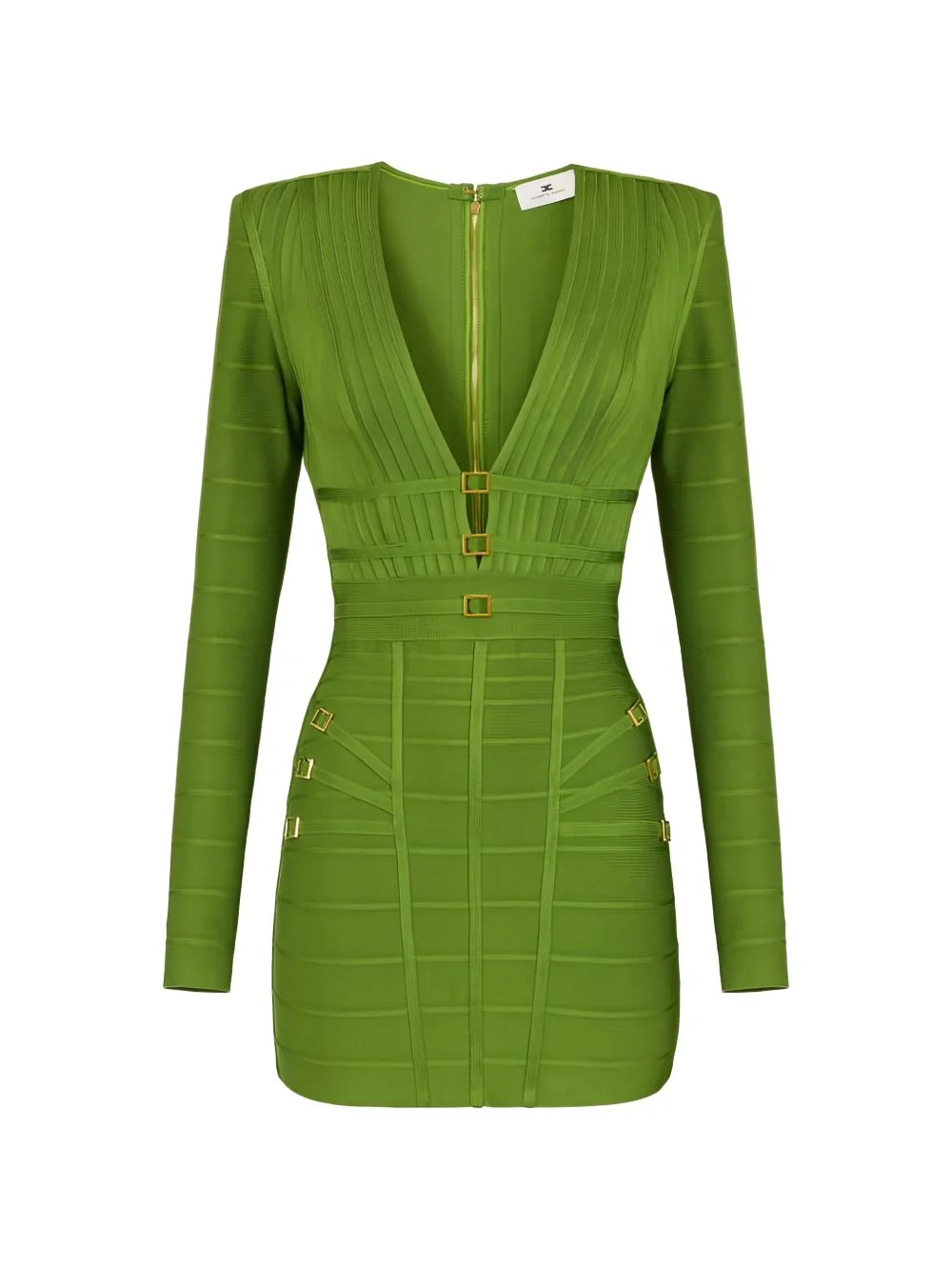 ribbed mini dress Highlights - Aloe green - Geometric design - Metallic rings - V-neck - Long sleeves - Zip fastening Imported Composition Viscose 90%, Polyamide 9%, Spandex/Elastane 1% Washing instructions Read Manufacturer Guidelines