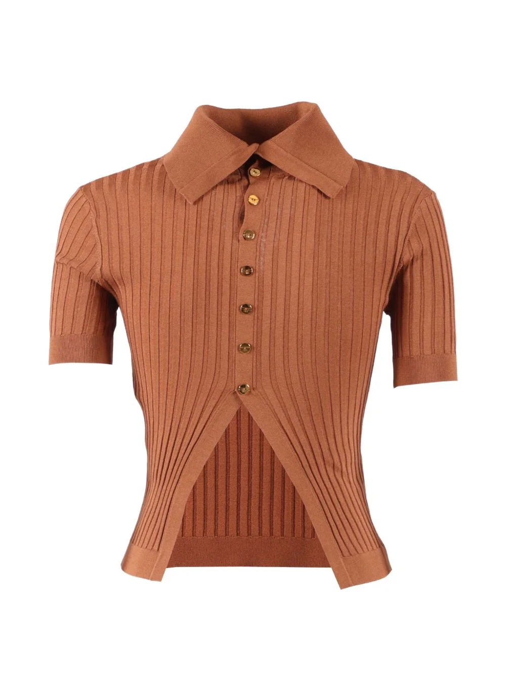 ribbed roll-neck top Highlights - Brown - Ribbed knit - Front button fastening - Roll neck - Asymmetric hem - Short sleeves Imported Composition Viscose 71%, Polyester 29% Washing instructions Read Manufacturer Guidelines