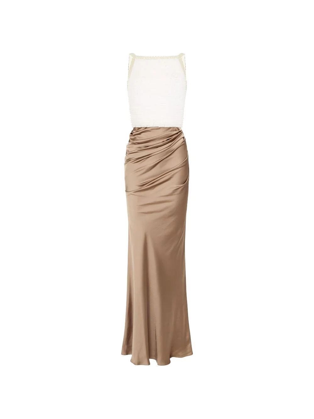 ruffled draped maxi dress Highlights - Ivory and clay - Satin skirt - Draped detail - Straps - Bare back Made in Italy Composition Polyester 100% Washing instructions Read Manufacturer Guidelines