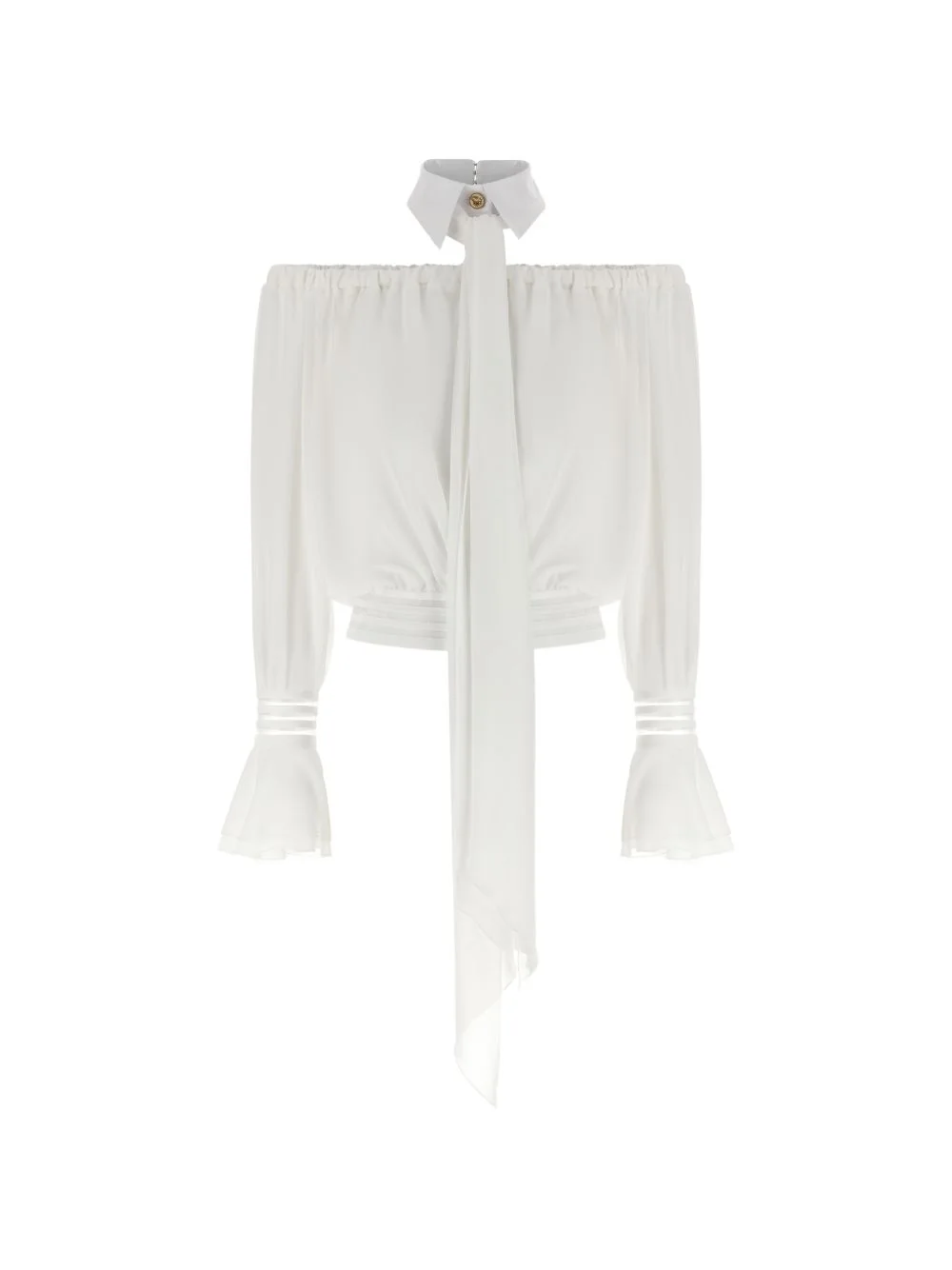 off-the-shoulder blouse Highlights - White - Semi-sheer - Elasticated upper band - Ruffled sleeves - Elasticated hem Made in Italy Composition Polyester 100% Washing instructions Read Manufacturer Guidelines