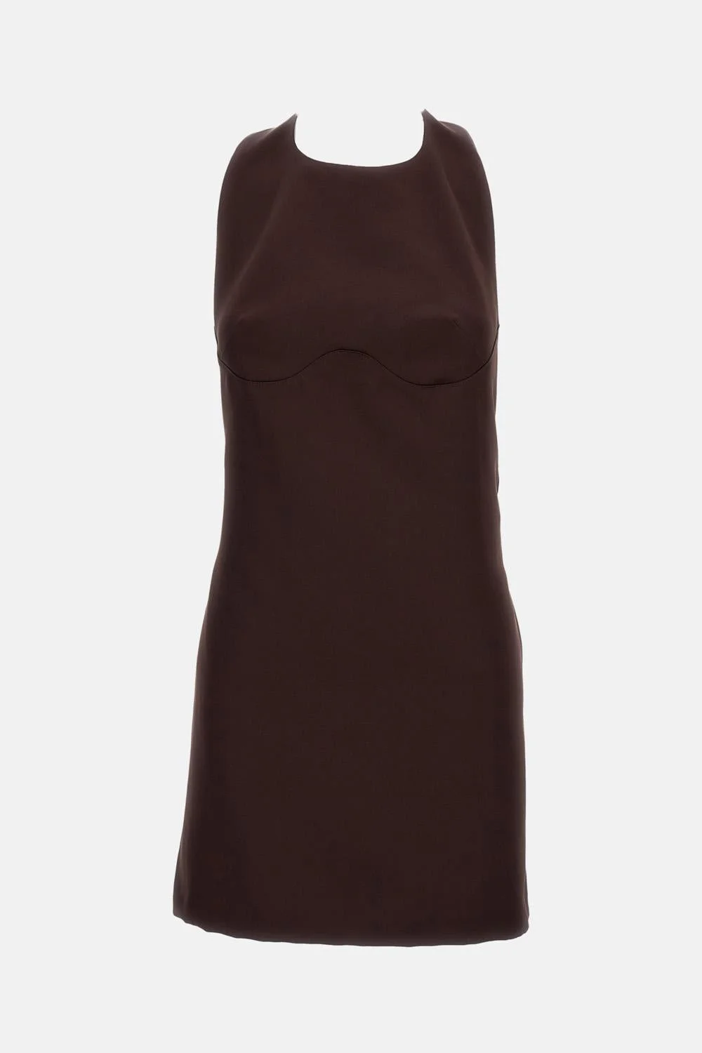 Short duchesse dress A-line silhouette Halter neckline fastened at the back with buttons Moulded cups Hidden side pockets Open back Gold-toned iconic logo chain cascading along the back neckline Concealed zip at the back Colour: brown Made in Italy Details and Care Color: Marrone Composition: 100% PL Made in: Italia Sku: AB87162E2644