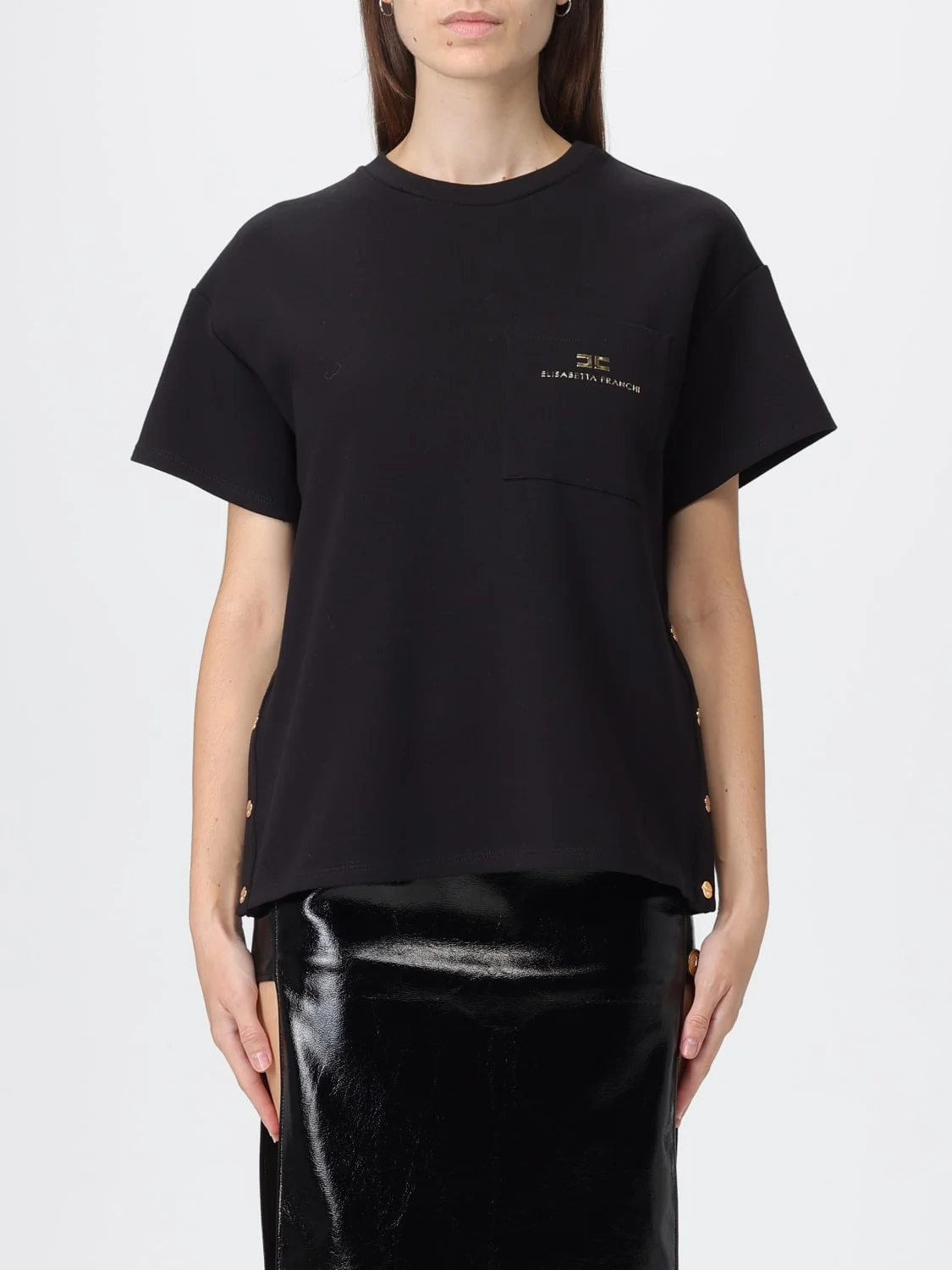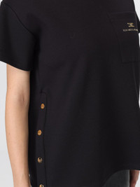 DESCRIPTION - Style: Contemporary - Logo: Contrasting - Details: With buttons - Model: Crewneck - Neckline: Crewneck - Shoulders: Relaxed - Sleeves: Short - Pockets: Patch pocket - Bottom: With straight hemline - Materials: Cotton blend - Pattern: Logo, Plain-colored DETAILS AND CARE Composition 87% Cotone 8% Poliammide 5%Elastane SIZE AND FIT Sizes not available Size and fit Relaxed fit Designer code: MA027 110 Giglio Code: H24194 Designer: Elisabetta Franchi Collection: Elisabetta Franchi Woman Category: Clothing Elisabetta Franchi