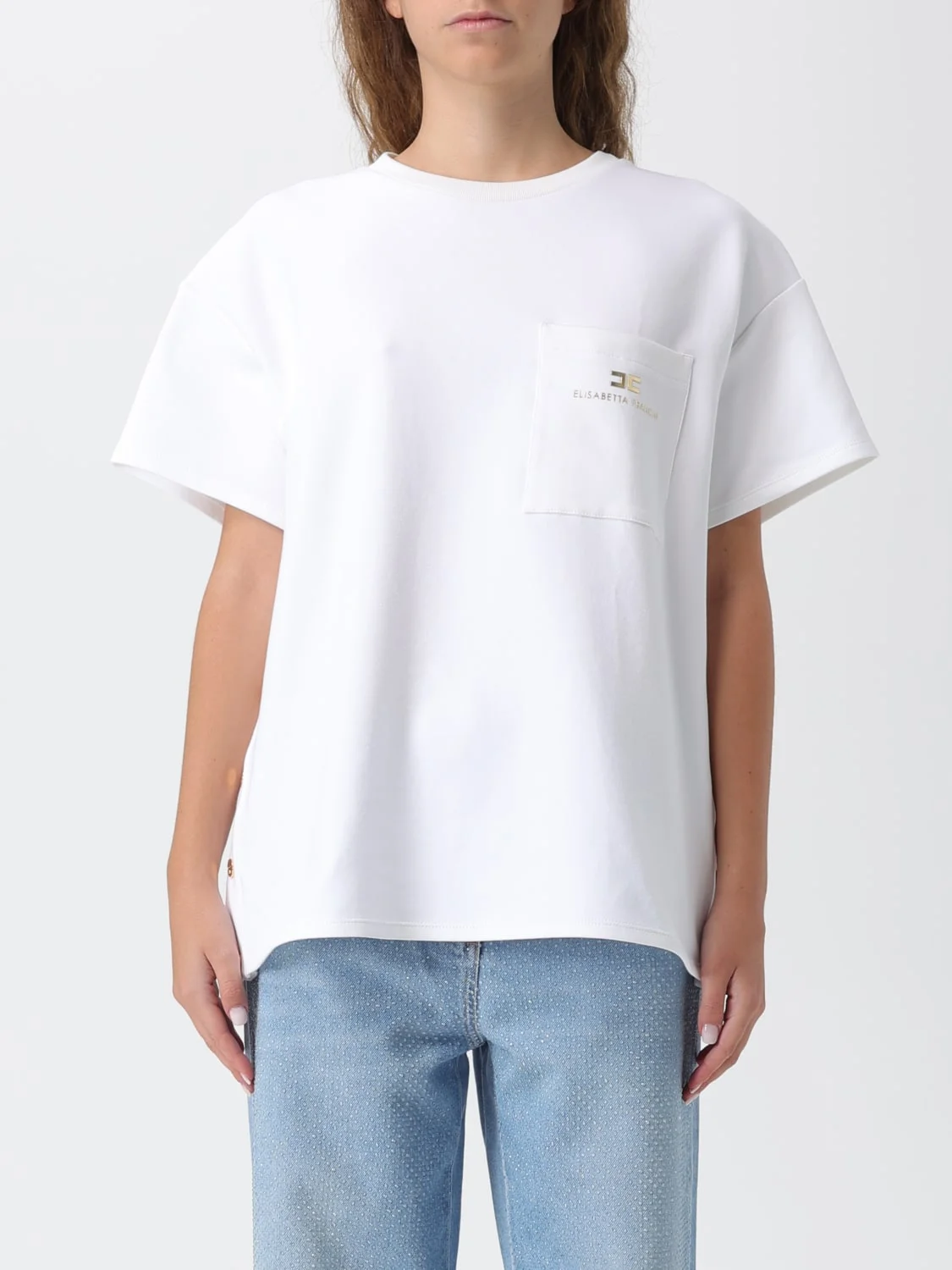 DESCRIPTION - Style: Contemporary - Logo: Contrasting - Details: With buttons - Model: Crewneck - Neckline: Crewneck - Shoulders: Relaxed - Sleeves: Short - Pockets: Patch pocket - Bottom: With straight hemline - Materials: Cotton blend - Pattern: Logo, Plain-colored DETAILS AND CARE Composition 87% Cotone 8% Poliammide 5%Elastane SIZE AND FIT Sizes not available Size and fit Relaxed fit Designer code: MA027 270 Giglio Code: H24194 Designer: Elisabetta Franchi Collection: Elisabetta Franchi Woman Category: Clothing Elisabetta Franchi