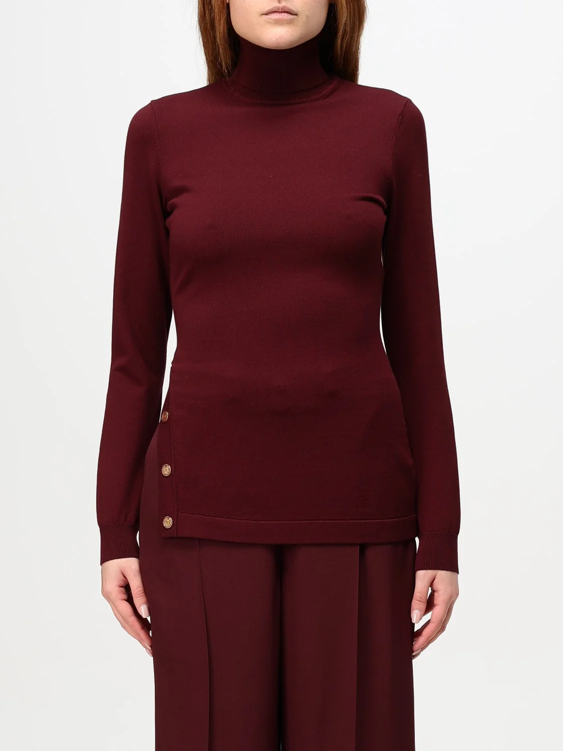 DESCRIPTION - Style: Minimal - Details: With buttons - Neck: Turtleneck - Shoulders: Regular - Sleeves: Long - Bottom: With side slit, With straight hemline - Materials: Viscose blend - Pattern: Plain-colored DETAILS AND CARE Composition co SIZE AND FIT Sizes not available Size and fit Slim fit Designer code: MK99S CG3 Giglio Code: G04845 Designer: Elisabetta Franchi Collection: Elisabetta Franchi Woman Category: Clothing Elisabetta Franchi