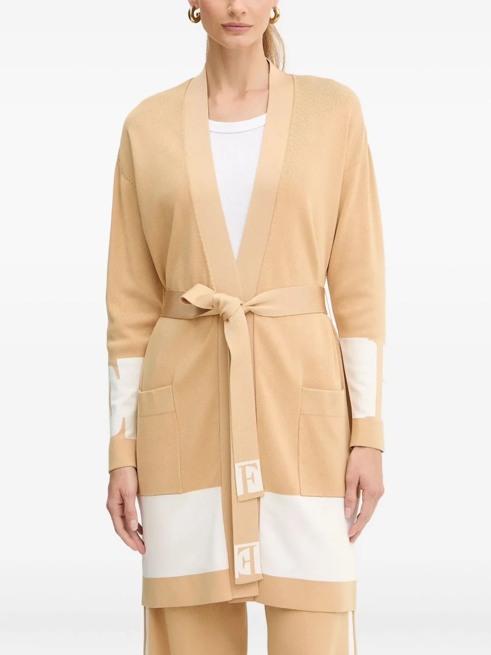 tie-waist pocket knitted coat Highlights - Light brown - Open front - Belt - Front pockets - Block panels - Logo detail on the sleeves Imported Composition Viscose 82%, Polyamide 18% Washing instructions Read Manufacturer Guidelines