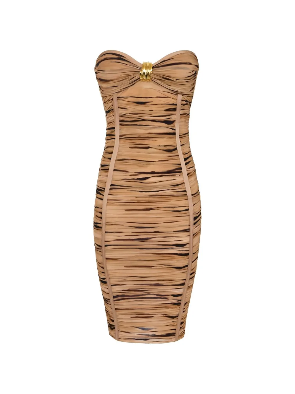 tiger-print jewel-clasp dress Highlights - Camel - Tiger print - Jewel clasp - Off-the-shoulder - Midi skirt - Satin trims Made in Italy Composition Body: Polyamide 77%, Spandex/Elastane 23% Washing instructions Read Manufacturer Guidelines