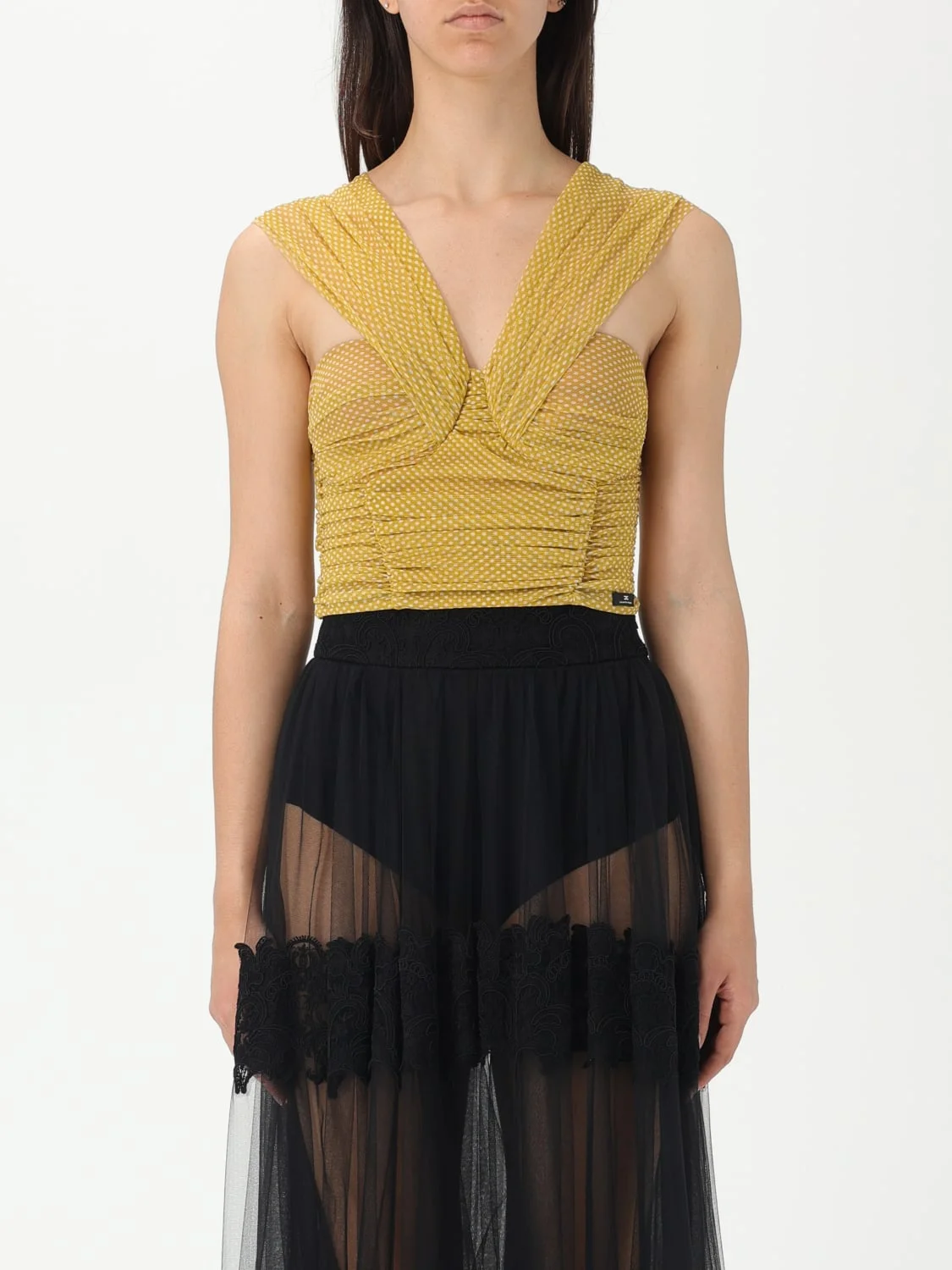 DESCRIPTION - Style: Elegant, Glamour - Model: Pleated - Neckline: V neckline - Shoulders: Regular - Closure: Back closure with zip - Bottom: With straight hemline - Sleeves: Off-the-shoulder tops - Materials: Crepe - Pattern: Polka dots DETAILS AND CARE Composition not available SIZE AND FIT Sizes not available Size and fit Slim fit Designer code: TO034 DK5 Giglio Code: G92232 Designer: Elisabetta Franchi Collection: Elisabetta Franchi Woman Category: Clothing Elisabetta Franchi