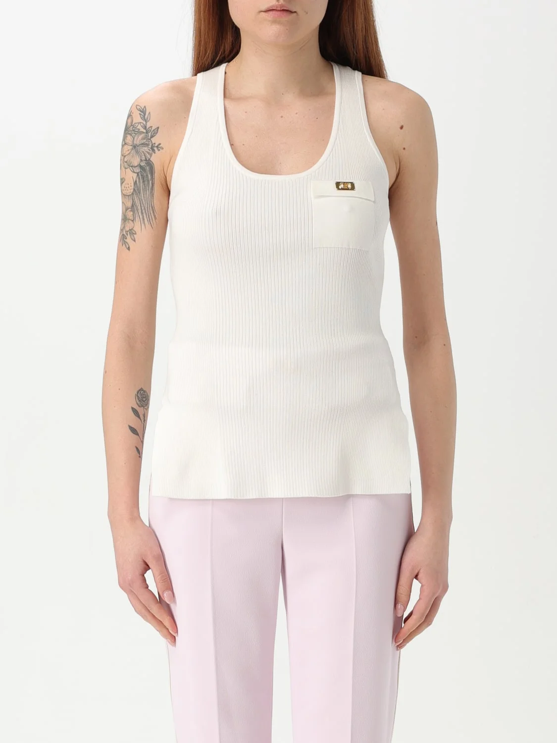 DESCRIPTION - Style: Basic - Logo: Metallic - Neckline: Crewneck , Olympic neckline - Bottom: With straight hemline - Sleeves: Off-the-shoulder tops - Materials: Lyocell - Pattern: Logo, Plain-colored DETAILS AND CARE Composition 64%ly20%pa16%se SIZE AND FIT Sizes not available Size and fit Slim fit Designer code: TK41B 360 Giglio Code: G63392 Designer: Elisabetta Franchi Collection: Elisabetta Franchi Woman Category: Clothing Elisabetta Franchi