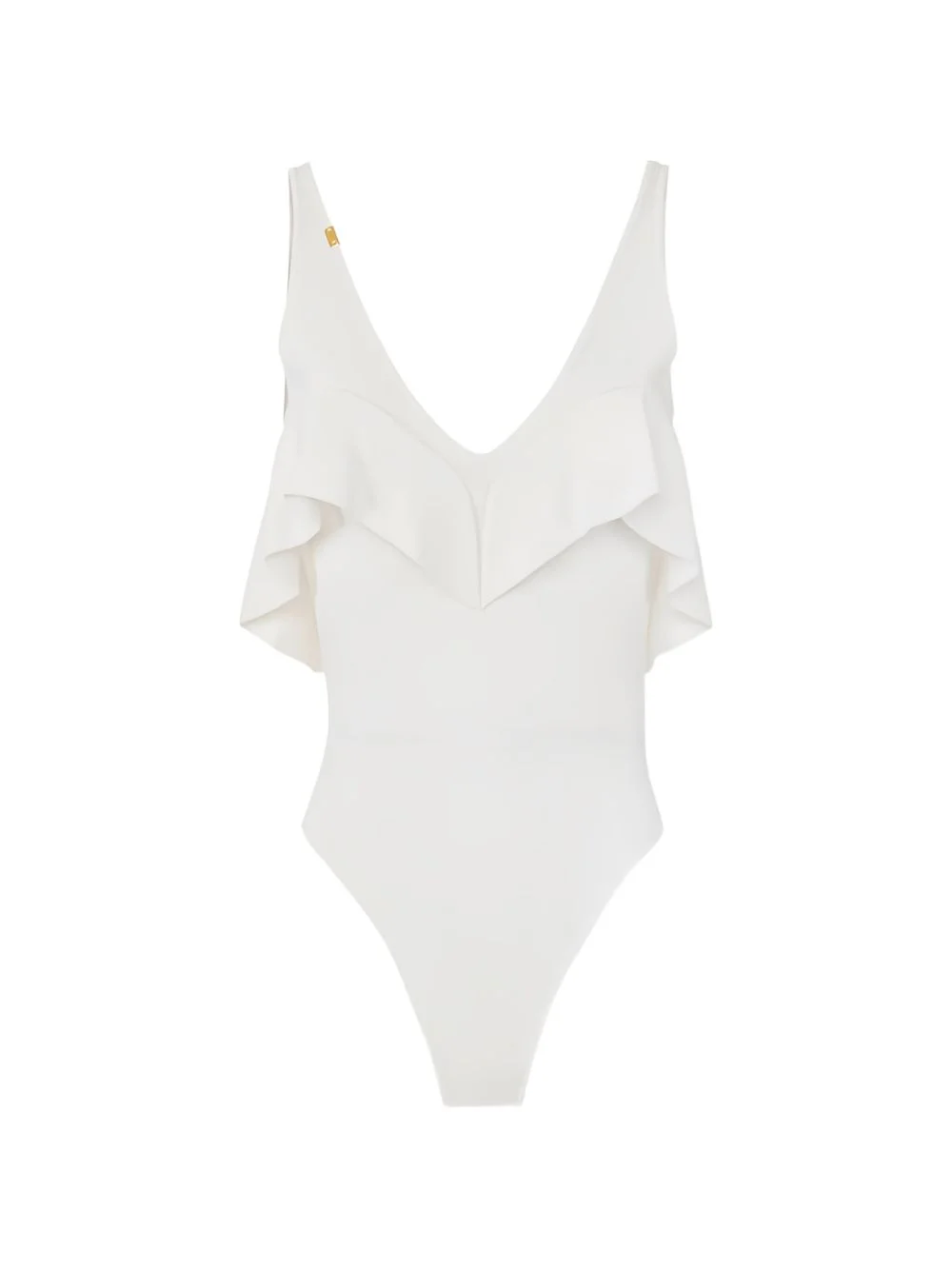 V-neck flounce bodysuit Highlights - Ivory - V-neck - Flounce detailing front back - Metal logo detail - Sleeveless - Slim fit - Just a reminder that this piece must be tried on over your own garments. Imported Composition Viscose 65%, Polyamide 35% Washing instructions Read Manufacturer Guidelines