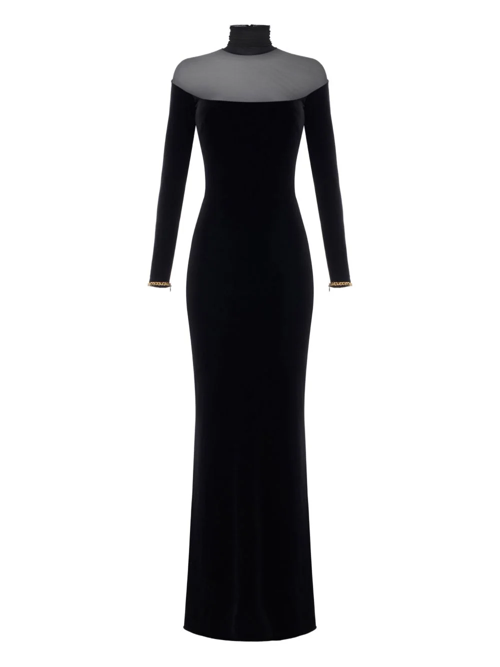 velvet mesh-insert maxi dress Highlights - Black - Velvet fabric - Mesh inserts - Long sleeves - High neck - Chain embellishment at the cuffs Made in Italy Composition Polyester 90%, Elastane 10% Washing instructions Read Manufacturer Guidelines
