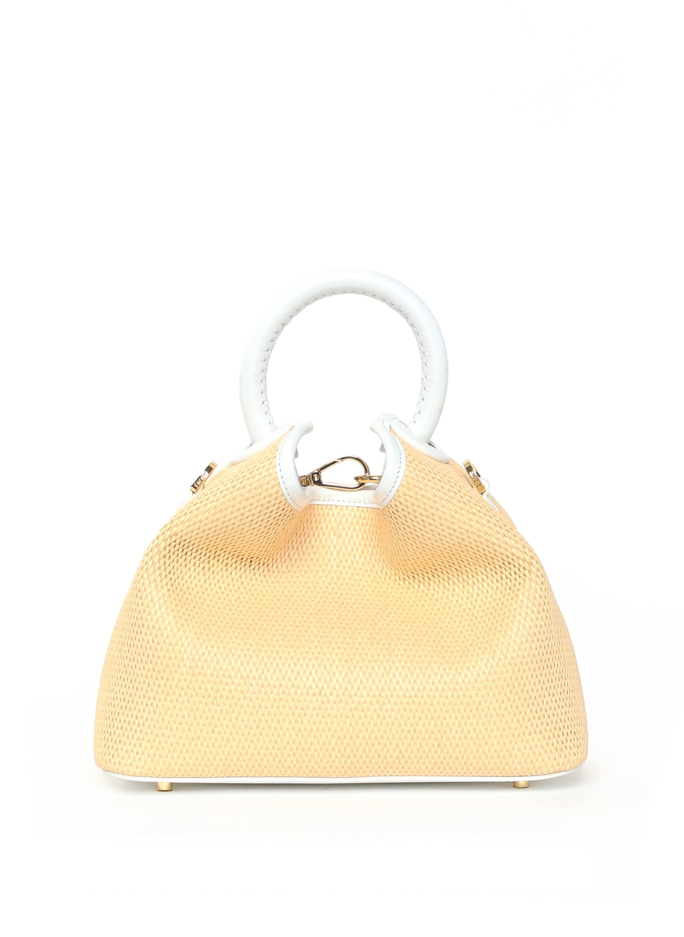 Size: Width: 23cm // 9" Height: 18cm // 7" Depth: 12cm // 4,7" Weight: 420g Strap drop: 46cm to 53cm // 18" to 20" Description: Inspired by the shape of the Chinese "Dumpling", the Baozi bag is the medium size of the signature line, featuring functionality and Italian craftsmanship Adjustable strap for shoulder or crossbody wear Inner zip and flat pockets Magnetic closure 18k gold-plated hardware Protective studs on the bottom Made in Italy Material: Exterior: Body in Raffia // Handle and Strap in Leather Lining: Microfiber suede