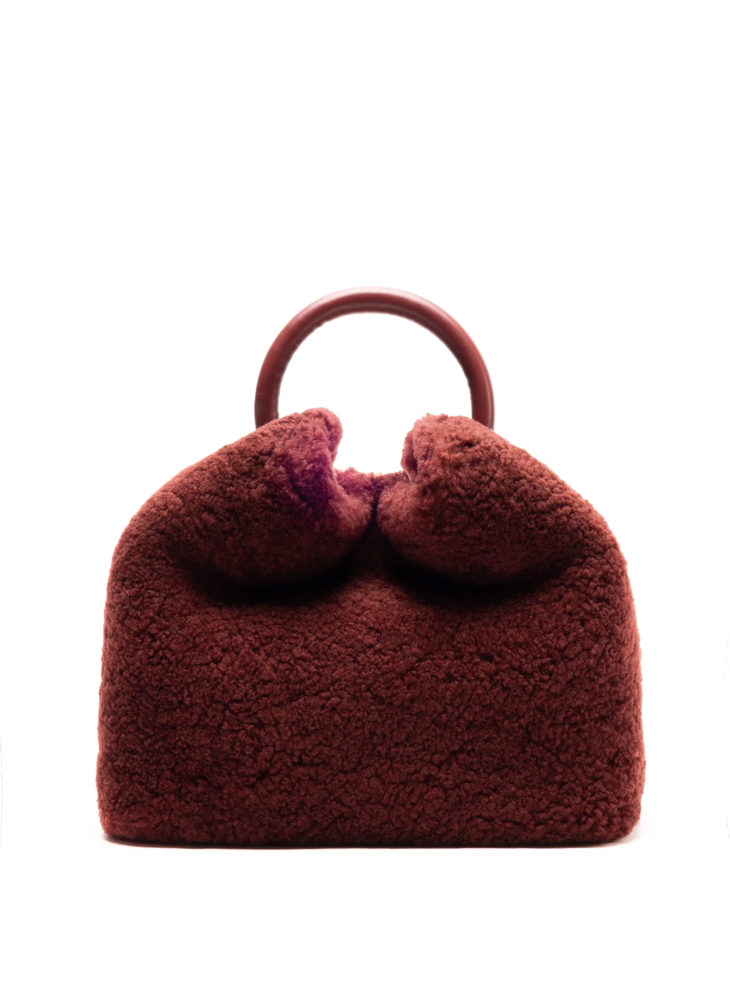 Inspired by the shape of the Chinese "Dumpling", the Baozi bag is the medium size of the signature line, featuring functionality and Italian craftsmanship. Details Width: 23cm // 9" Height: 18cm // 7" Depth: 12cm // 4,7" Weight: 415g Strap drop: 46cm to 53cm // 18" to 20" Exterior: Body in Shearling // Handle and Strap in Leather Lining: Microfiber suede Adjustable strap for shoulder or crossbody wear Inner zip and flat pockets Magnetic closure 18k gold-plated hardware Protective studs on the bottom Made in Italy