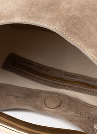 Accentuated by a sumptuous metal top handle, the Boomerang Large boasts the signature Elleme shape, epitomizing effortless chic Details Width: 27cm // 11" Height: 25cm // 10" Depth: 15cm // 5.9" Weight: 620g Strap drop: 46cm // 18" Exterior: 100% Suede leather Lining: Microfiber suede Removable strap for a shoulder or crossbody wear Inner zip and flat pockets Magnetic closure 18k gold plated hardware Protective studs on the bottom Made in Italy