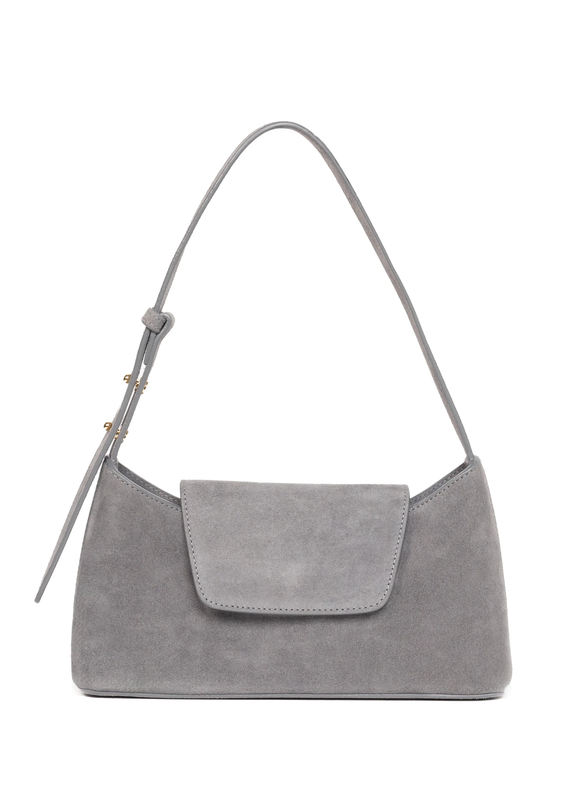 Envelope-shaped shoulder bag with 18k gold plated hardware. Details Bottom width - 26cm Top width - 21cm Middle height - 13cm Side height - 14cm Depth - 5,5cm Strap drop - from 4 to 22cm Strap width - 2,3cm Exterior: 100% Suede Leather Lining: Microfiber suede Adjustable top handle Magnetic front flap closure Internal slip pocket Made in Italy