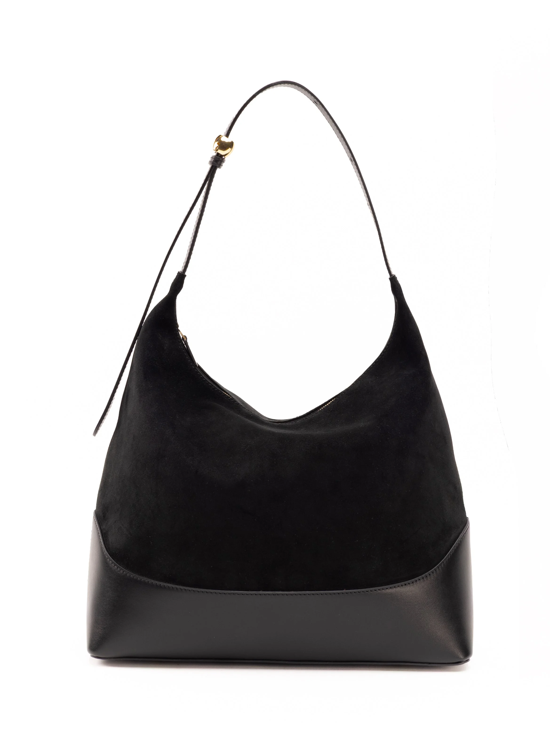 Versatile hobo tote bag with shoulder strap. Zip closure keeps your essentials safe and organised. Interior zipper pocket. Details Bottom Width: 32 cm // 12.6" Side Height: 35 cm // 13.8" Middle Height: 25 cm // 9.8" Depth: 13.5 cm // 5.3" Zip Length: 32 cm // 12.6" Strap Drop: 10 cm to 34 cm // 3.9" to 13.4" Exterior: Body in Suede and Leather // Strap in Leather Lining: Microfiber suede Adjustable thin shoulder strap Top zip fastening with 18k gold plated hardware Made in Italy