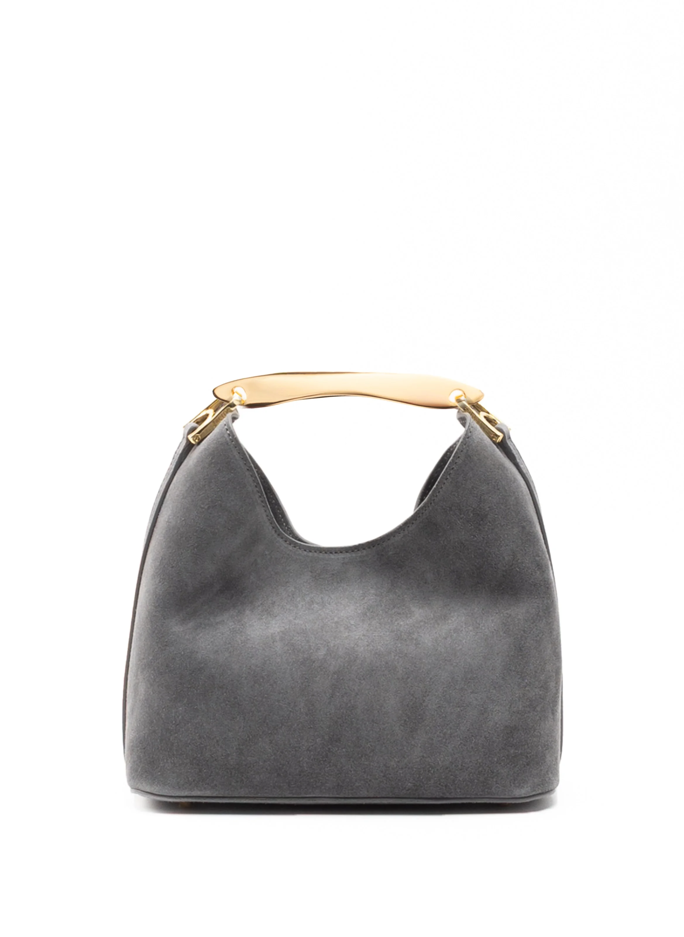 With its compact size, luxurious craftsmanship, and sophisticated metal top handle, the Boomerang Small pays homage to Elleme's signature aesthetic Details Width: 22cm // 9" Height: 22cm // 9" Depth: 10cm // 4" Weight: 400g 46cm to 53cm // 18" to 20" Exterior: 100% Suede Leather Lining: Microfiber suede Removable and adjustable strap for a shoulder or crossbody wear Inner flat pocket Magnetic closure 18k gold plated hardware Protective studs on the bottom Made in Italy