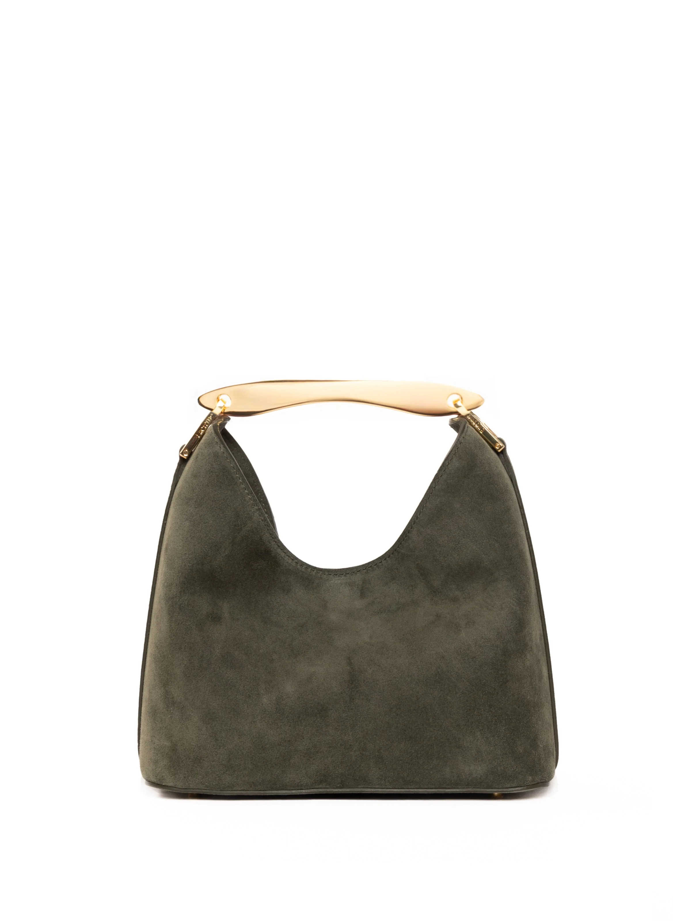 With its compact size, luxurious craftsmanship, and sophisticated metal top handle, the Boomerang Small pays homage to Elleme's signature aesthetic Details Width: 22cm // 9" Height: 22cm // 9" Depth: 10cm // 4" Weight: 400g 46cm to 53cm // 18" to 20" Exterior: 100% Suede Leather from Italian tannery Lining: Microfiber suede Removable and adjustable strap for a shoulder or crossbody wear Inner flat pocket Magnetic closure 18k gold plated hardware Protective studs on the bottom Made in Italy