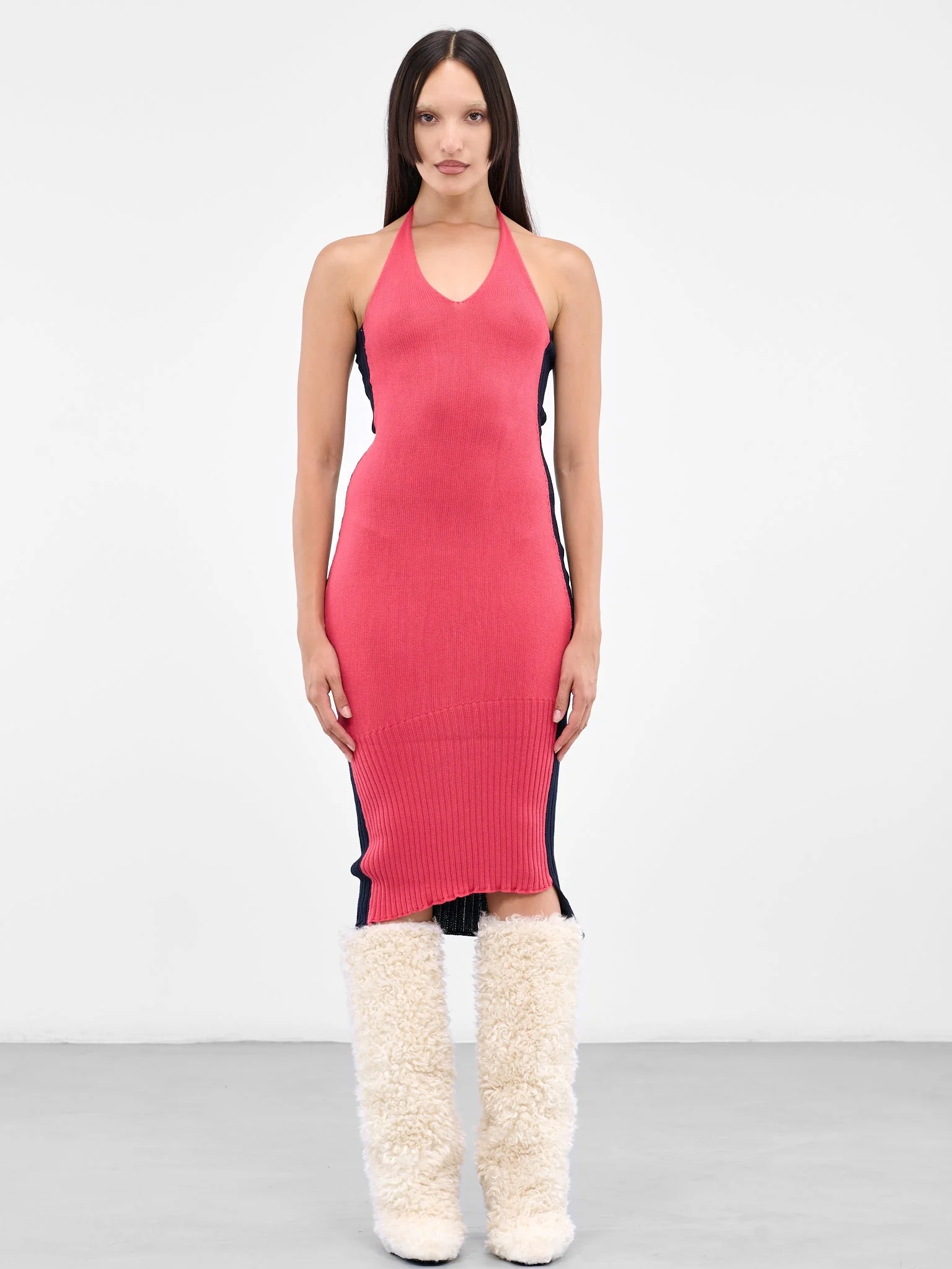 ELL/SS dress in red navy, two-tone asymmetric design, rib knit, organic cotton, deep plunging neckline, halter tie, open back, midi length, fitted. Made in Slovenia Standard Sizing 100% Organic Cotton Model is 5'8" wearing size S. Bust: 32" Waist: 26" Hips: 34.5"