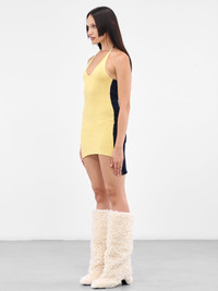 ELL/SS dress in yellow navy, two-tone asymmetric design, rib knit, organic cotton, deep plunging neckline, halter tie, open back, mini length, fitted. Made in Slovenia Standard Sizing 100% Organic Cotton Model is 5'8" wearing size S. Bust: 32" Waist: 26" Hips: 34.5"