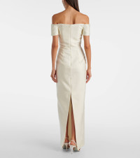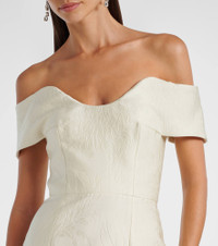 The Aislinn floor-length, fitted pencil gown from Emilia Wickstead is crafted from striking ivory cloque. This sculpted, strapless piece is embossed with a subtle floral motif and finished with a back vent for ease of movement. Product Details - Material: 90% polyester, 10% silk - Care instructions: dry clean - Made in the UK - Designer color name: Ivory Cloque - Item color: white - Lining: 73% acetate, 27% silk - Built-in bustier - Boning - Closure: zipped back - Long vent - Fully lined - Item number: P01051519 Size & Fit - Fits large to size - we recommend trying one size smaller - Off-the-shoulder - Cinched waist - Non-stretchy fabric - slit length 66cm-26" - The model seen in the picture is 178cm-5'10" and wearing a size UK 6