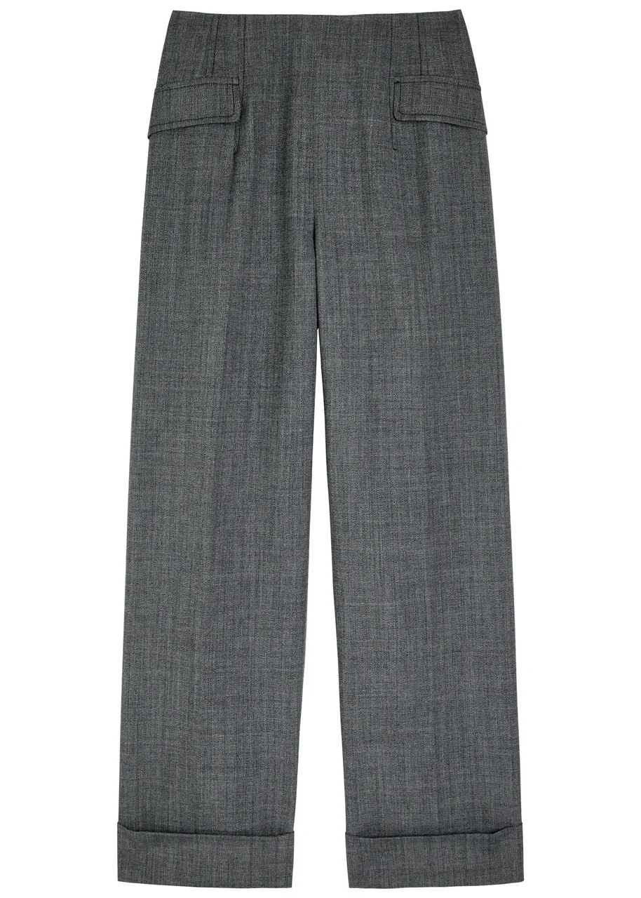 Info & Care Emilia Wickstead woven trousers Faux flap pockets at front, pressed crease through legs, turn-up cuffs, fully lined Concealed hook and zip fastening through back 55% recycled polyester, 45% wool; lining: 73% acetate, 27% silk Dry clean Size & Fit Inside leg length: 30 inches/ 76cm Midweight High-waist fit, straight-leg cut Model is 5'10"/ 178cm and wears a size;UK8
