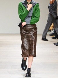 Emilia Wickstead draws on Tippi Hedren's costumes in The Birds for Fall '25 – the croc-effect finish of this skirt exudes that '60s glamour. Dressed down at the show with a sweater and boots, it's made from leather that's deeply embossed so the 'scales' catch the light. Size & Fit - Fits true to size, take your normal size - Midi-length, designed to be worn at the waist - Firm, non-stretchy material - Model is 177cm/ 5'10" and is wearing a UK 8 Model measurements: - Bust: 85cm/ 33” - Waist: 66cm/ 26” - Hip: 92cm/ 36” Details & Care - Tonal-brown croc-effect leather - Concealed hook and zip fastening at back - 100% leather (Sheep) - Fully lined - Dry clean - Designer color: Coco