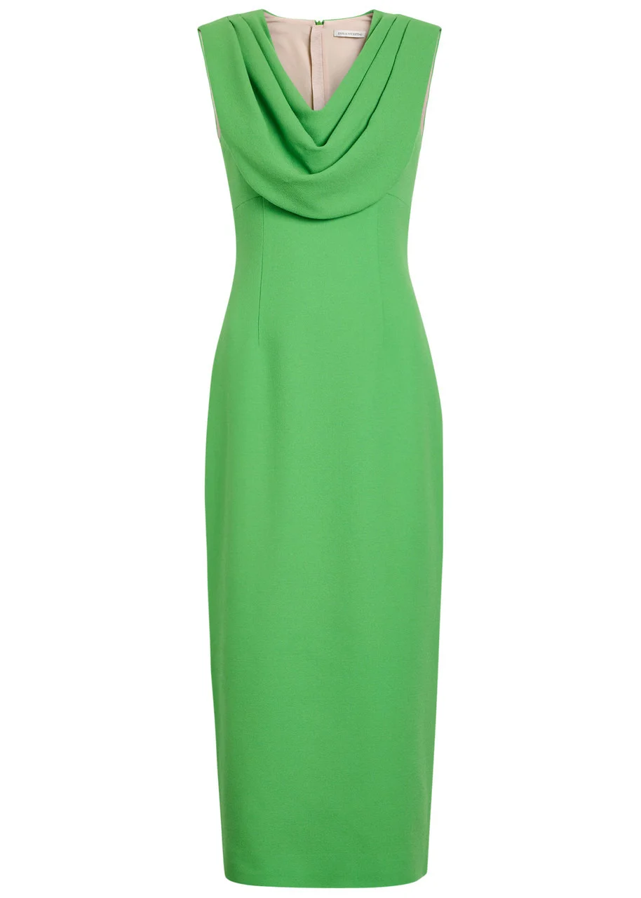Info & Care Emilia Wickstead crepe dress Draped panel with pleated details at V-neck, darted waist, back vent, fully lined Concealed zip fastening at back 100% polyester Dry clean Size & Fit Length shoulder to hem: 49.5 inches/ 126cm Midweight Slim fit Model is 5'10"/ 178cm and wears a size;UK8
