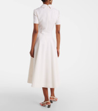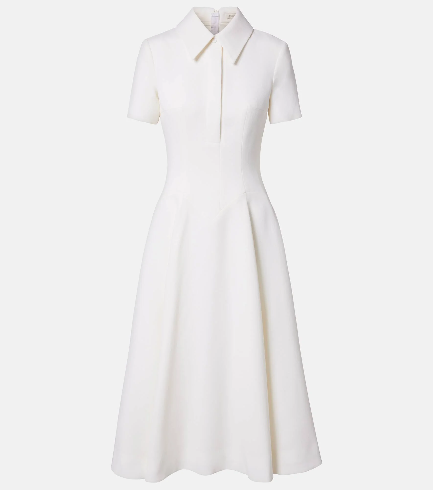 Crafted from wool, the Jody midi dress from Emilia Wickstead features short sleeves and a high collar. This design's fitted waist is complemented by its subtly flared pleated skirt. Product Details - Material: 100% wool - Care instructions: dry clean - Made in the UK - Designer color name: Ivory - Item color: white - Lining: 100% polyester - Collar: classic (Straight point) - Closure: concealed buttoned front - Sleeves: short-sleeved - Item number: P01051518 Size & Fit - True to size - Cinched waist - Non-stretchy fabric - The model seen in the picture is 178cm-5'10" and wearing a size UK 8