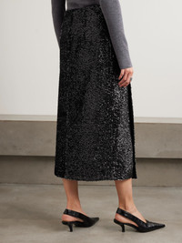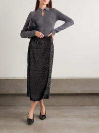 Emilia Wickstead's Fall '25 collection is inspired by the iconic style of the silver screen. This 'Kanji' skirt is made with crepe and covered in scores of sequins, which create a gorgeous shimmer and make it hang beautifully, too. Size & Fit - Fits true to size, take your normal size - Midi-length, designed to be worn at the waist - Mid-weight, heavily embellished, non-stretchy fabric - Model is 177cm/ 5'10" and is wearing a UK 8 Model measurements: - Bust: 85cm/ 33” - Waist: 66cm/ 26” - Hip: 92cm/ 36” Details & Care - Black crepe - Concealed hook and zip fastening at back - 100% polyester - Unlined - Dry clean