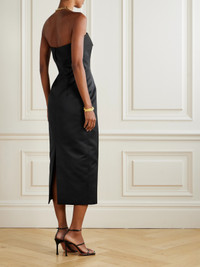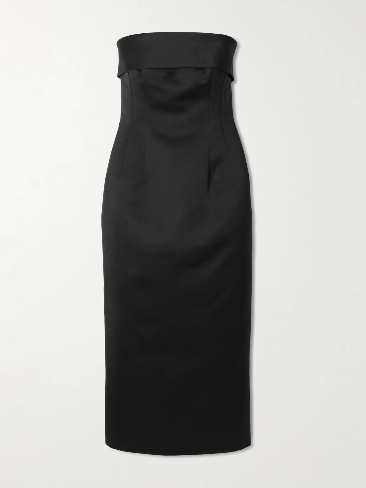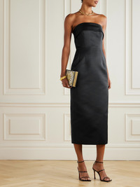 Drawing inspiration from the film Juliet of the Spirits ; Emilia Wickstead's collection re-imagines "occasion dressing through the lens of cinematic fantasy". The designer's favorite style for cocktail parties, this 'Keeley' dress is cut from duchesse-satin in a sculpting column shape and has a strapless fold-over neckline.