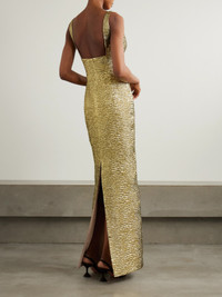 Emilia Wickstead's 'Micheline' gown is made from metallic seersucker that catches light from every angle. Designed with a sleek column skirt, it has a fitted empire waist and an elegant square neckline.