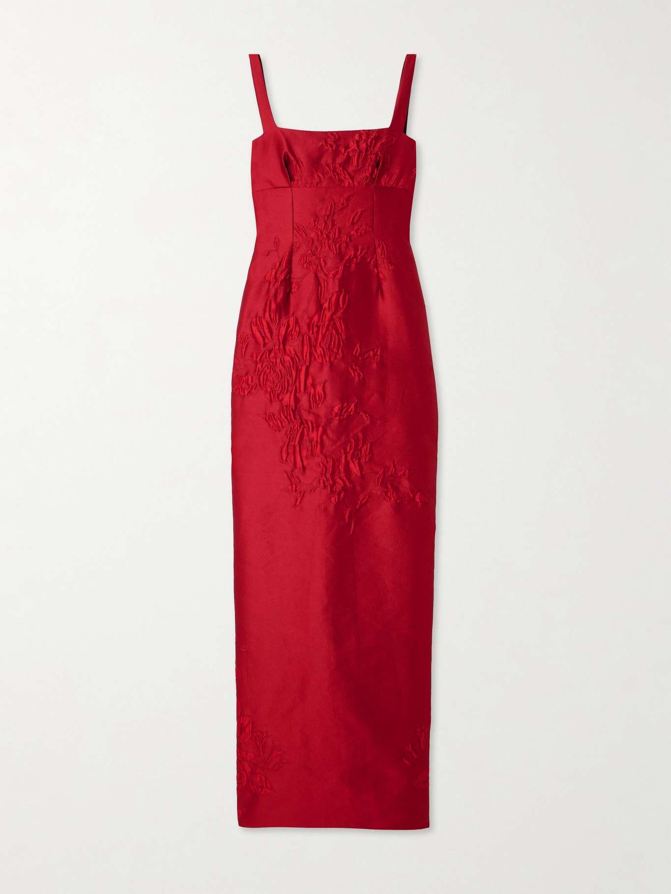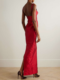 EDITORS'NOTES The roses stamped on Emilia Wickstead's 'Micheline' gown tell a tale of romance. Made from cloque, it has a decolletage-baring square neckline and a slit racing down the longline cut. Wear yours with a matching red lip. SIZE & FIT Model measurements: - Fits true to size, take your normal size - Designed for a close fit - Mid-weight, non-stretchy fabric - Model is 180cm/ 5'11" and is wearing a UK 8 - Bust: 80cm/ 31.5" - Waist: 65cm/ 25.5" - Hip: 89cm/ 35" DETAILS & CARE - Tonal-red cloque - Concealed zip fastening along back - 97% polyester, 3% polyamide; lining: 100% polyester