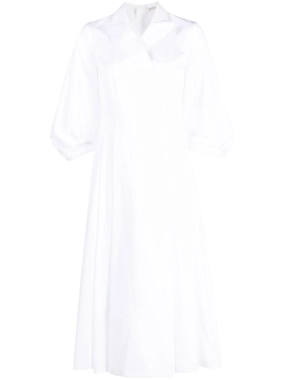 peak-lapels cotton midi dress Highlights - White - Cotton - Peak lapels - Fitted waistline - Two side slit pockets - Three-quarter length puff sleeves - Mid-length - Straight hem Made in United Kingdom Composition Outer: Cotton 100% Lining: Cotton 100% SIZE & FIT Model measurements Height 5 ft 10 in(1.79 m) Bust/Chest 32.67 in(83 cm) Hips 34.25 in(87 cm) Waist 24.4 in(62 cm) FittingInformation Designed for a close fit at the chest and waist with a loose fit at the hip Made from a midweight non-stretch fabric This piece fits true to size – take your usual size Washing instructions Hand Wash