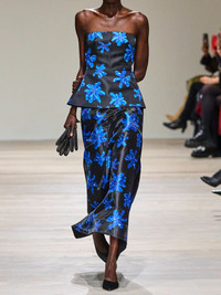 Inspired by the power of costuming, Emilia Wickstead's Fall '25 collection embodies "poise, resilience, and vulnerability". This 'Regan' top is cut from floral-print faille in a strapless, peplum shape with supportive internal boning. Wear yours with the matching skirt, as it was styled on the runway. Size & Fit - Fits true to size, take your normal size - Cut for a close fit - Internal bust support - Mid-weight, non-stretchy fabric - Model is 177cm/ 5'10" and is wearing a UK 8 Model measurements: - Bust: 85cm/ 33” - Waist: 66cm/ 26” - Hip: 92cm/ 36” Details & Care - Black and tonal-blue faille - Concealed hook and zip fastening at back - 100% polyester - Fully lined - Dry clean - Designer color: Electric Blue Floral