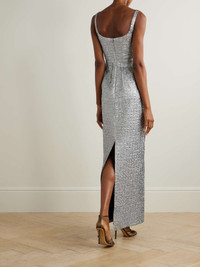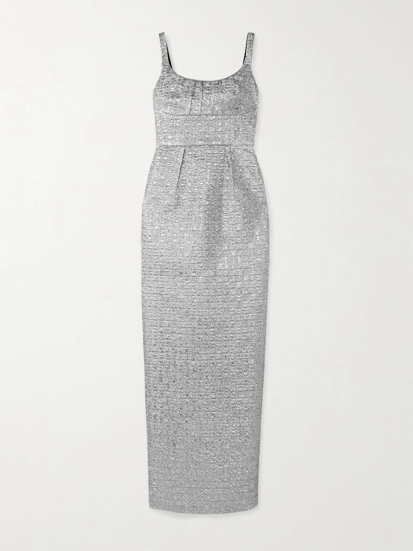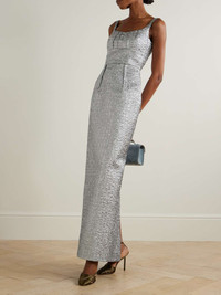 EDITORS'NOTES Emilia Wickstead's 'Sharon' maxi dress is made from silver seersucker which glimmers in the light – the same fabric was used to create a look for Gillian Anderson, who glowed while wearing it on the Emmys red carpet. Defined by a nipped-in waist, it has a scooped, pintucked bodice and a column skirt that skims the floor. SIZE & FIT Model measurements: - Fits true to size, take your normal size - Designed for a close fit - Mid-weight, non-stretchy fabric - Model is 180cm/ 5'11" and is wearing a UK 8 - Bust: 80cm/ 31.5" - Waist: 65cm/ 25.5" - Hip: 89cm/ 35" DETAILS & CARE - Silver seersucker - Concealed zip fastening along back - 46% metallized polyester, 33% silk, 21% polyamide; lining: 100% polyester