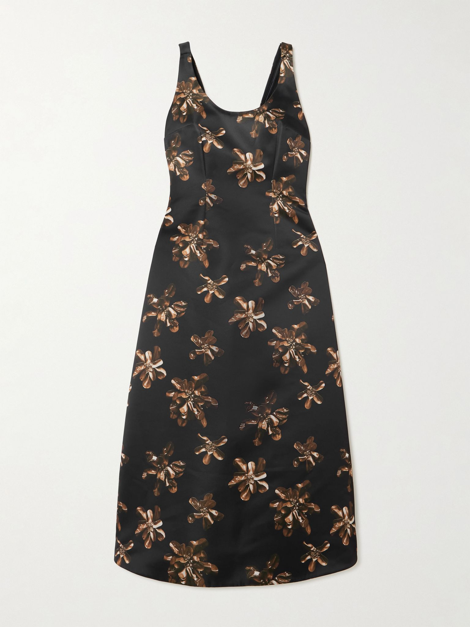 Emilia Wickstead's Fall '25 collection is inspired by the "remarkable women" behind Alfred Hitchcock's 1963 film, The Birds'. Named after the movie's leading actress, this 'Tippi' dress is made from lustrous satin and patterned all-over with hyper realistic flowers. It has a retro fit-and-flare silhouette and looks especially chic with point-toe flats. Size & Fit - Fits true to size, take your normal size - Cut to be fitted at the bust and waist, slightly loose at the hip - Mid-weight, structured, non-stretchy fabric - Model is 180cm/ 5'11" and is wearing a UK 8 Model measurements: - Bust: 80cm/ 31.5" - Waist: 65cm/ 25.5" - Hip: 89cm/ 35" Details & Care - Black and tonal-brown satin - Concealed hook and zip fastening at back - 100% polyester - Dry clean - Designer color: Chocolate Floral on Black