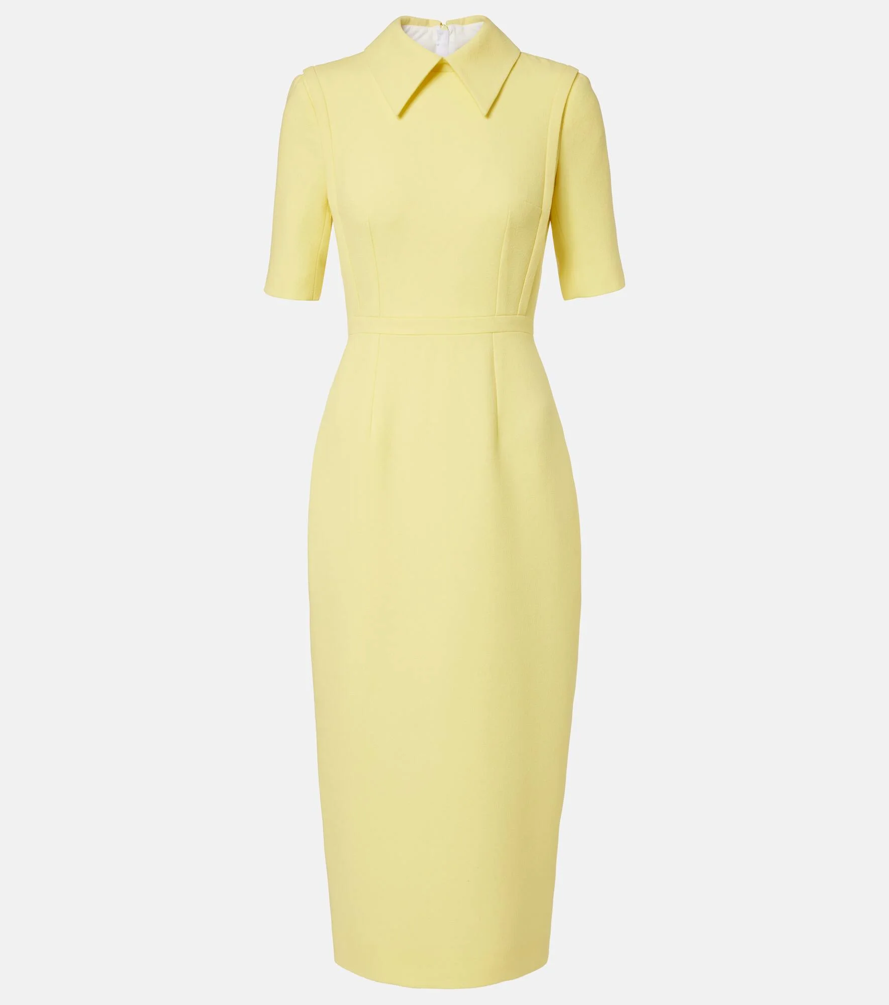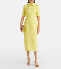 At once polished and pared-back, Emilia Wickstead proves that simple, well-executed silhouettes will stand out. The Valletta midi dress features a wool crepe construction with short sleeves, a pointed collar, and a zipped closure at the back. Product Details - Material: 100% wool - Care instructions: dry clean - Made in the UK - Color: yellow - Designer color name: Lemon - Lining: 100% polyester - Closure: concealed zipped back - Short vent - Item number: P01129078 Size & Fit - True to size - Cinched waist - Non-stretchy fabric - The model seen in the picture is 178cm-5'10" and wearing a size UK 8