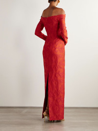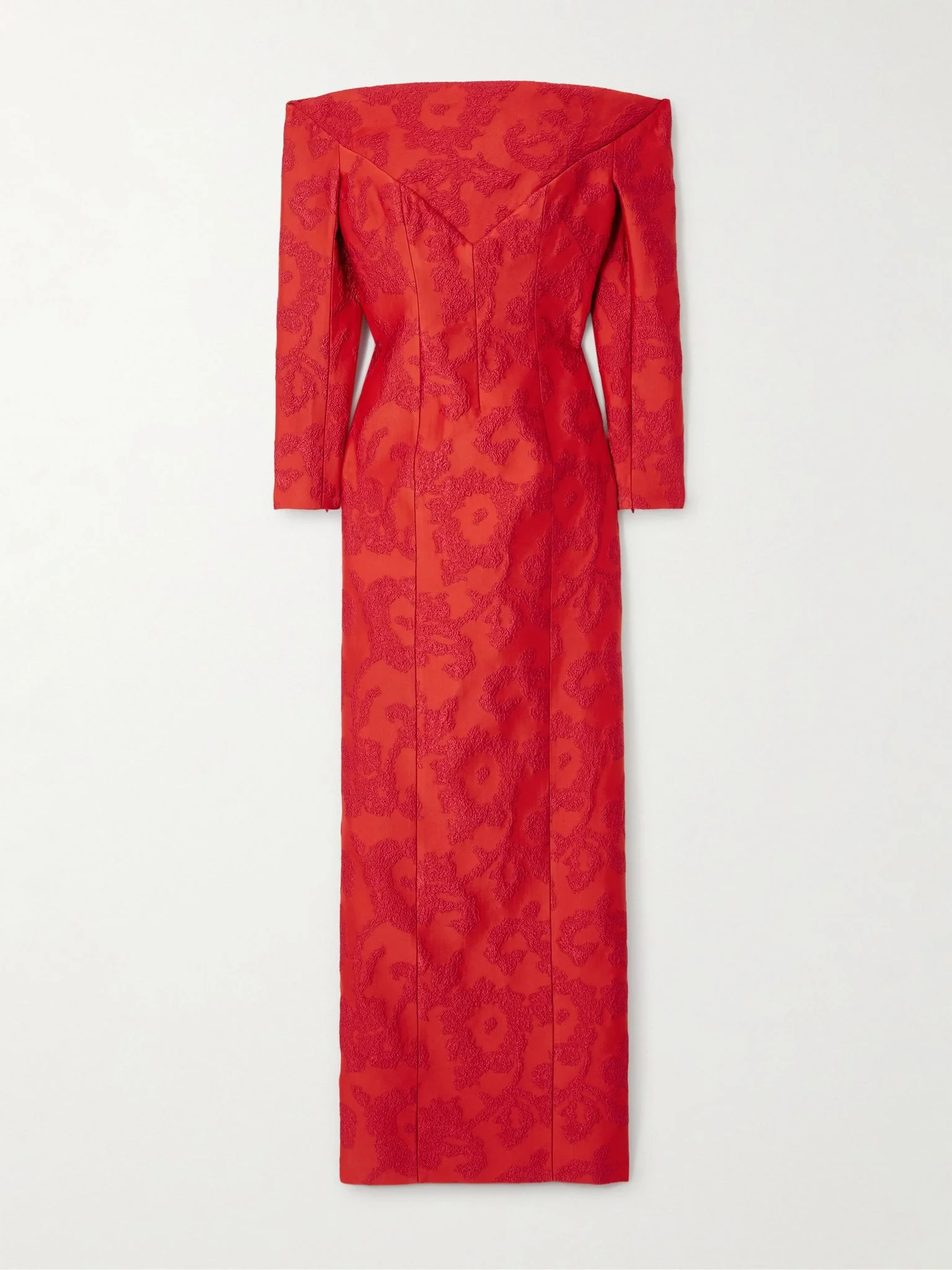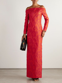 The color palette of Emilia Wickstead's Fall '25 collection echoes the emotions of Alfred Hitchcock's film The Birds. One of the closing looks on the runway, this 'Zarit' dress is cut from bright-red floral boucle-jacquard and has a structured profile with an off-the-shoulder neckline. Size & Fit - Fits true to size, take your normal size - Those with a curvy figure may wish to take the next size up - Designed for a slim fit - Mid-weight, non-stretchy fabric - Model is 177cm/ 5'10" and is wearing a UK 8 Model measurements: - Bust: 86cm/ 34" - Waist: 65cm/ 25.5" - Hip: 90cm/ 35.5" Details & Care - Red boucle-jacquard - Concealed hook and zip fastening at back - 44% polyamide, 42% polyester, 1% silk; lining: 73% acetate, 27% silk - Fully lined - Dry clean