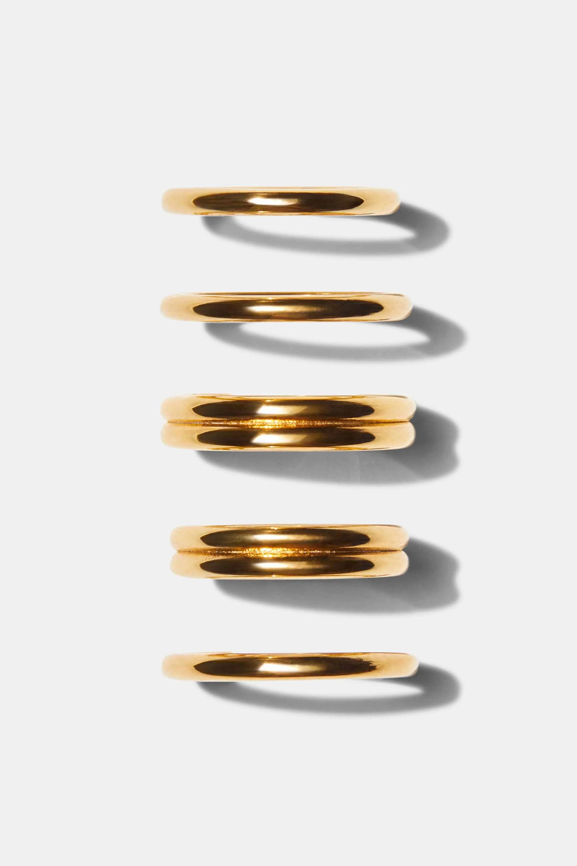 The 5 Ring Set is handcrafted in Italy from 14-karat gold plated brass and are sized to wear in a unique and individual manner. Each ring can stacked as mid or regular rings or styled toe rings to complement our selection of barely-there sandals. The delicate single and double bands are inspired by the bestselling Laurie Bijoux sandal and add a subtle shine to any look. SIZE & FIT Ring size for toe rings will generally match your standard ring size on your hands. MATERIALS & DETAILS - 14-karat gold-plated brass - Made in Italy