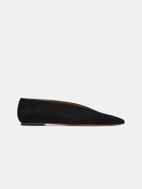 An every day flat with a sharp silhouette. The V-cutout at the decollete and pointed toe adds a polished precision. SIZE & FIT - Fits narrow, not recommended for wider feet - Fits regular or narrow feet best MATERIALS & DETAILS - Heel Measurement: .3" / 8mm - Blue calf hair - Made in Italy - Leather Working Group certified for responsible leather production