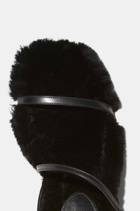 A square-toe sandal on a 50mm tapered heel, the Hugo gives a subtle lift to create a long silhouette. Calfskin straps create geometric lines across the foot and affix in a clasp, and the tapered heel supports a cozy shearling lining. SIZE & FIT - Fits true to size, take your normal size - Fits regular, narrow, and wide feet MATERIALS & DETAILS - Heel Measurement: 2" / 50mm - Black calfskin leather & black shearling fur - Buckle ankle strap - Made in Italy - Leather Working Group certified for responsible leather production
