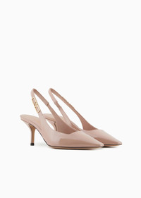 Pointed slingback court shoes, made of patent leather with an eagle logo on the strap. A selection of functional, versatile footwear made distinctive by the metal logo with the iconic eagle. Product Code: X3E478XF161100002 Details Composition 100% Bovine leather Heel height: 9.5 cm Patent leather Toe Ankle strap Metal logo plate Leather sole Made in Italy